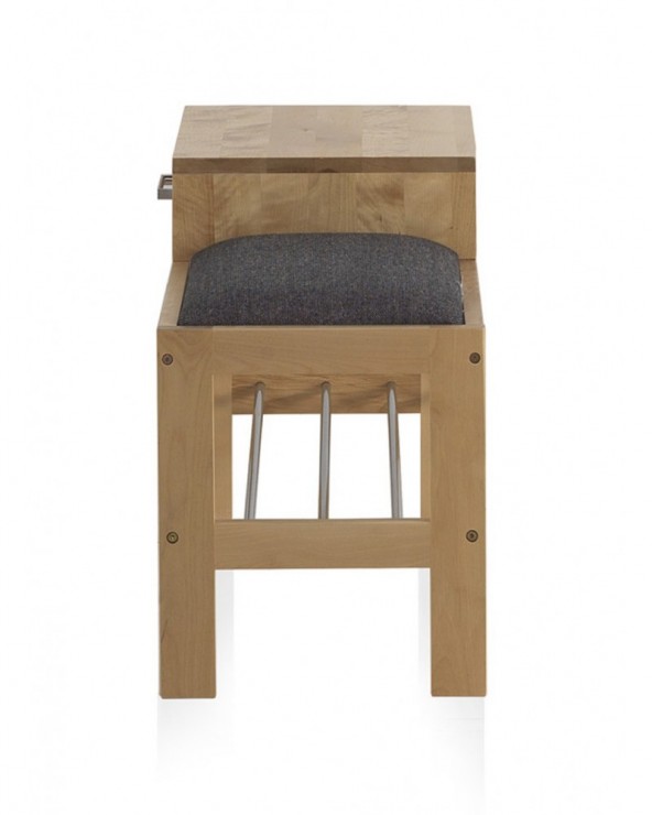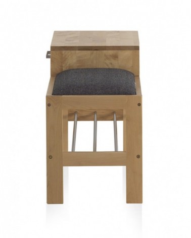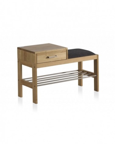 Banco-zapatero con cajón y área acolchada. Tirador y barras de metal. Fácil mantenimiento de uso. Limpieza con un paño húmedo con agua y jabón, evitando el contacto con solventes aromáticos, halogenados y cetonas. Recomendado para uso interior.