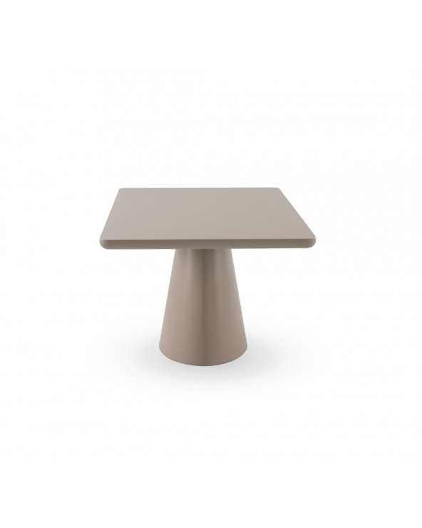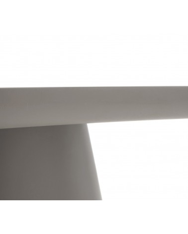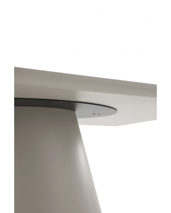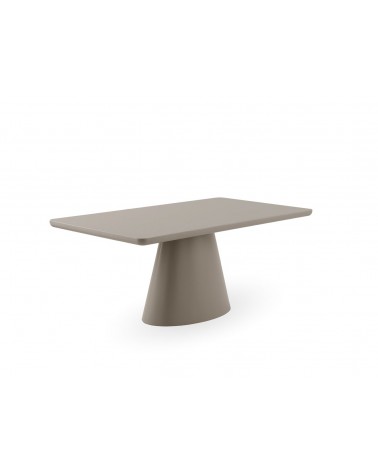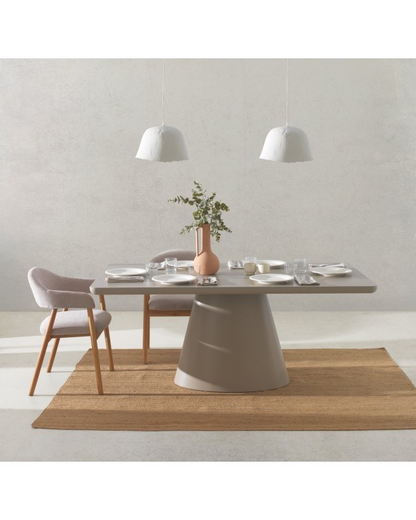 Mesa de comedor rectangular 180 x 100 cm, con tablero de 5 cm de grosor y esquinas ligeramente redondeadas, fabricada en MDF lacado con epoxy en color topo mate. Su base central, también en MDF lacada y pintada con epoxy resistente, presenta un tono topo mate y une visualmente el tablero. La base mide 78 cm de largo y deja una separación de 36 cm entre el borde exterior del tablero y la base, optimizando la distribución de peso y la comodidad al sentarse. Diseñada para acoger a 8-10 personas, ofrece estabilidad y estilo contemporáneo, y requiere un montaje sencillo de la base mediante la tornillería suministrada.