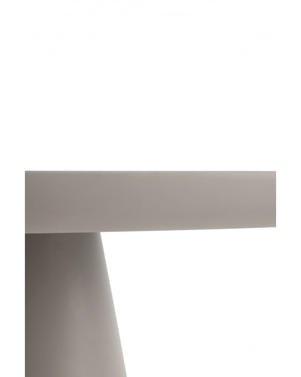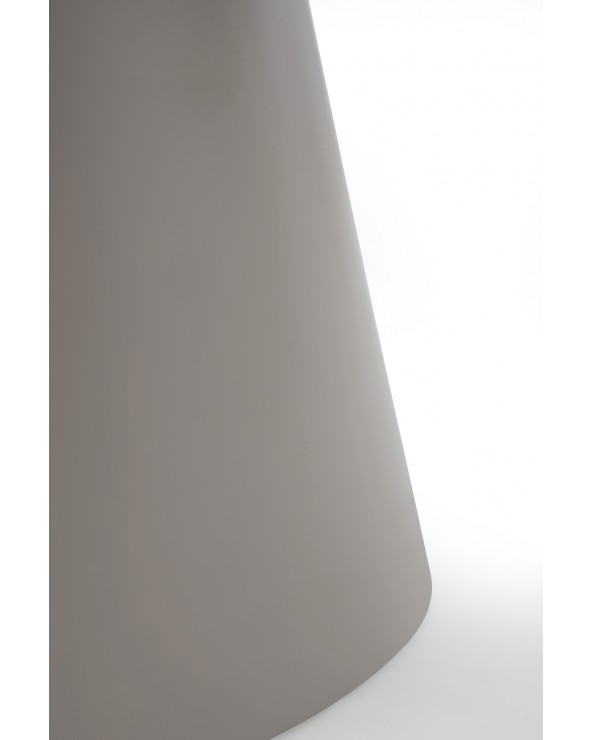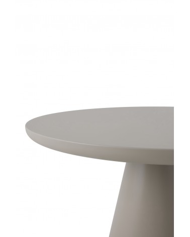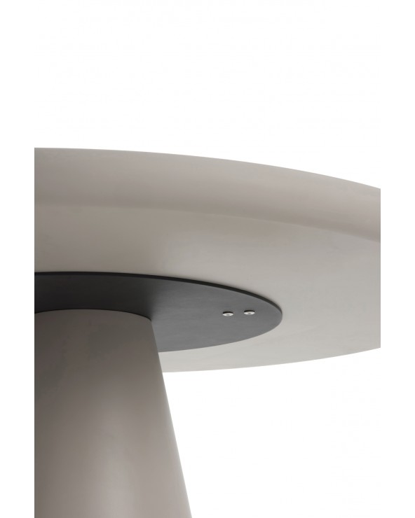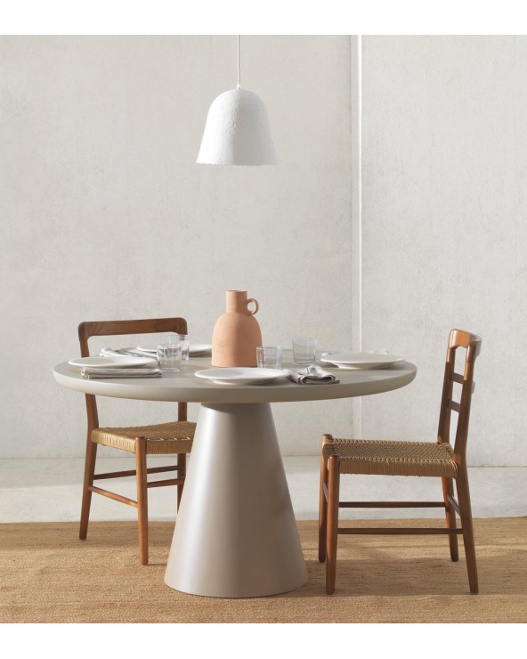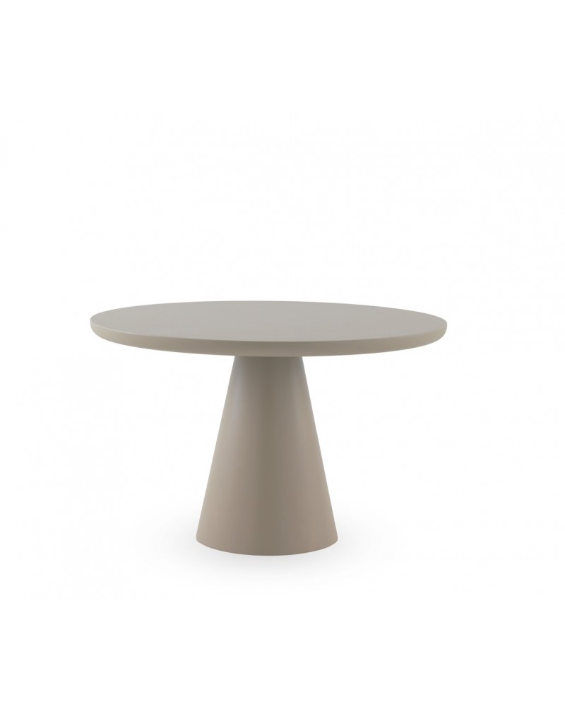 Mesa comedor redonda de 120 cm de diámetro, creada en MDF lacada epoxi color topo mate, con un tablero de 5 cm de grosor y borde ligeramente redondeado; su base central tiene forma cónica y 50 cm en su punto más ancho, lacada en color topo claro mate con pintura epoxi de alta resistencia. Diseñada para alojar de 4 a 6 personas, ofrece un estilo moderno y estable gracias a su base central y el acabado duradero. El montaje es sencillo: la base se instala fácilmente con la tornillería suministrada.
