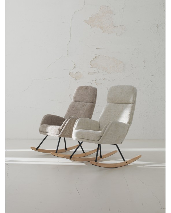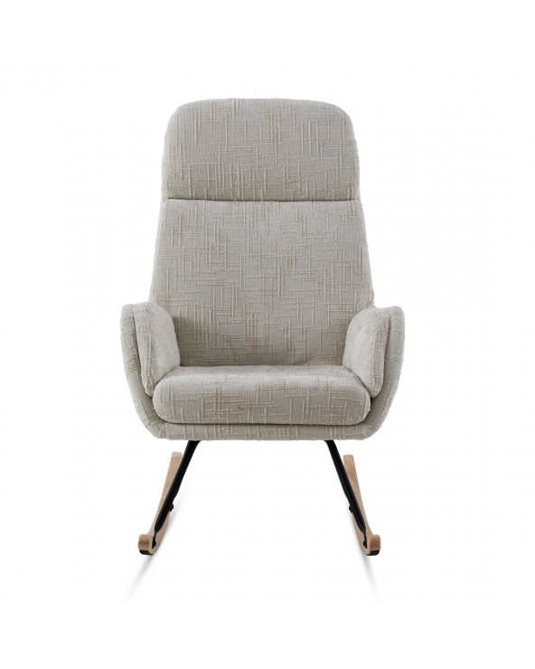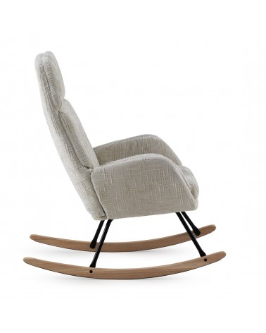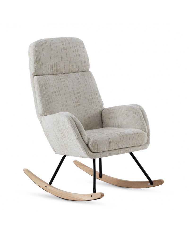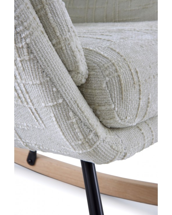El balancín tapizado en chenilla blanca cuenta con patas metálicas y patín de madera de haya. El tejido tapizado es 100% poliéster chenilla de tacto suave, y los patines son de madera de haya con protección para evitar rayaduras. El asiento es desenfundable mediante cremallera, la altura del asiento de 50 cm, la altura de respaldo de 72 cm y la altura de brazo de 61 cm. Requiere montaje.