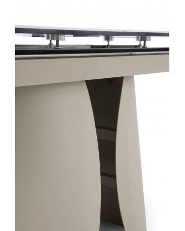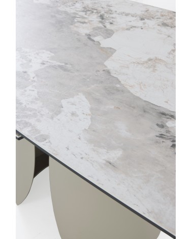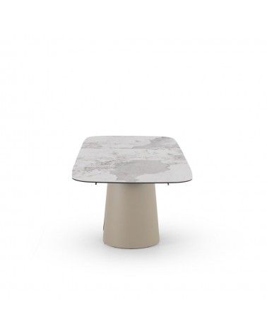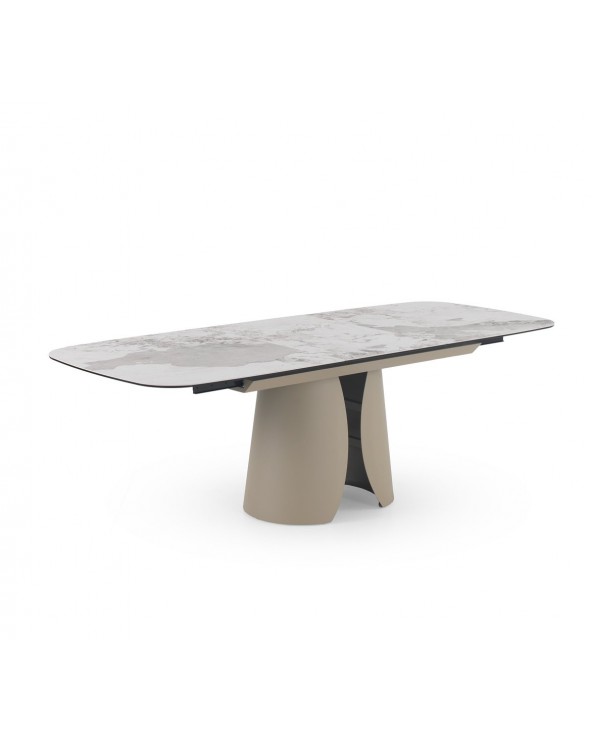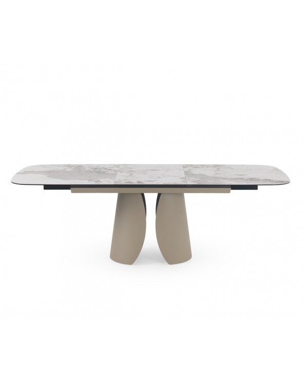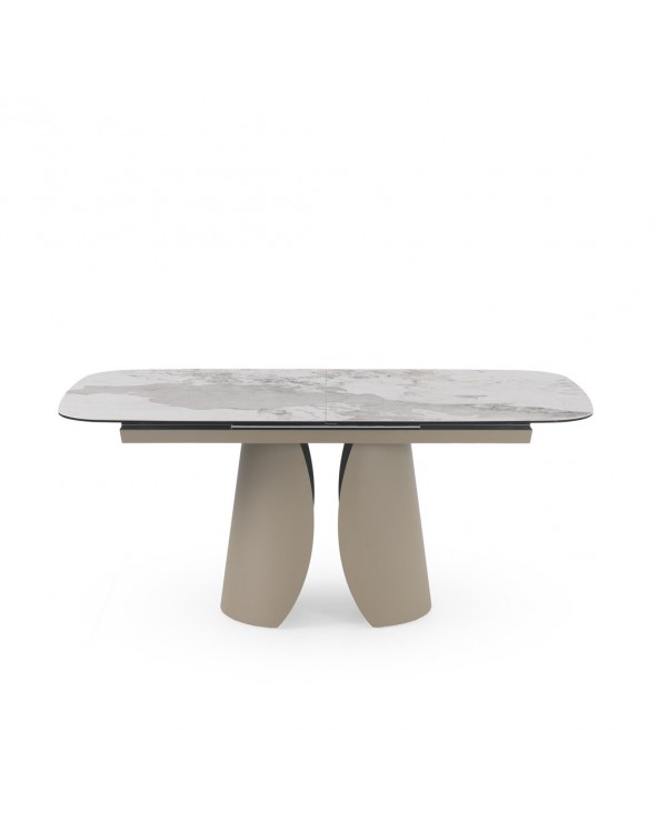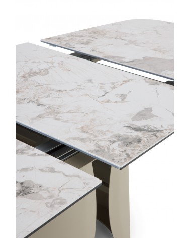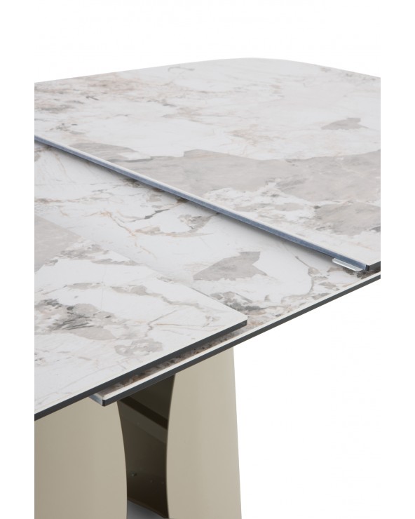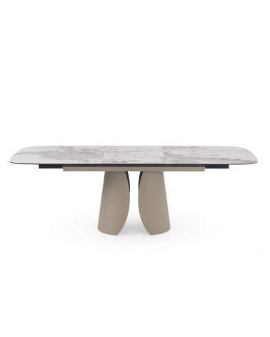 Mesa de comedor extensible de forma rectangular con esquinas redondeadas, medidas 180/240 x 95 cm, con extensión que permite aumentar de 180 a 240 cm de largo y apertura/cierre automáticos al tirar/empujar desde los dos extremos. Encimera de cerámica tipo granito Patagonia color blanco, acabado mate y un espesor de 1 cm. Pies y estructura metálicos en color topo, diseñado para soportar el peso de la tapa y brindar estabilidad. Capacidad para 8-10 comensales, ideal para reuniones; requiere montaje, ya que es un artículo pesado.