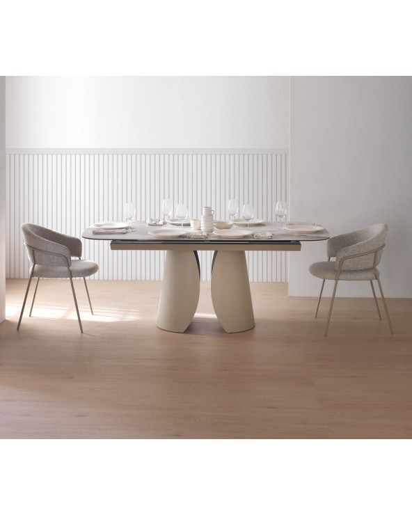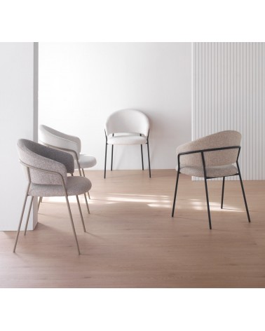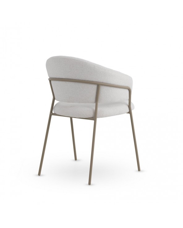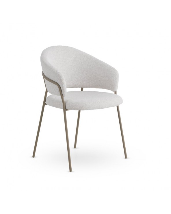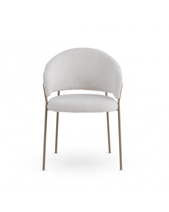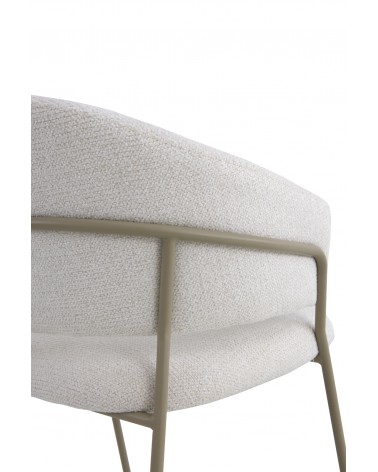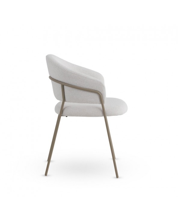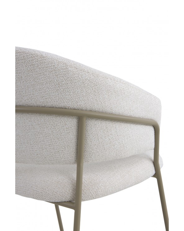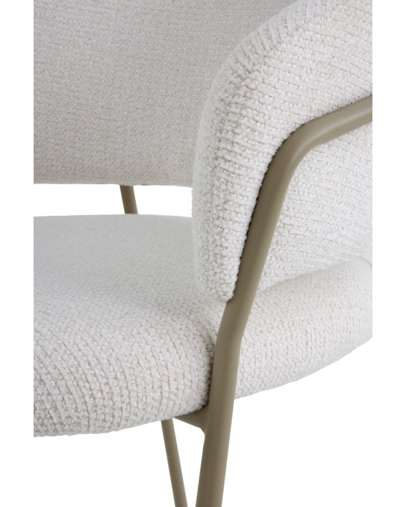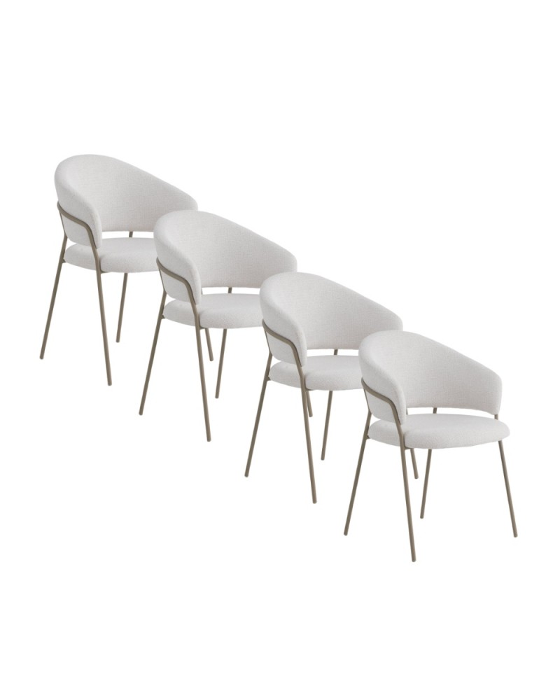 Pack de 4 sillones tapizados en chenilla color crema, un tejido de tacto muy suave que aporta elegancia y confort, con estructura y patas de metal en color topo que garantizan estabilidad y durabilidad. Cada sillón cuenta con un asiento de 48 cm de altura, respaldo de 35 cm, apoyabrazos a 68 cm, y unas medidas de asiento de 45 cm de ancho por 47 cm de profundidad. El montaje es sencillo, únicamente requiere fijar las patas.