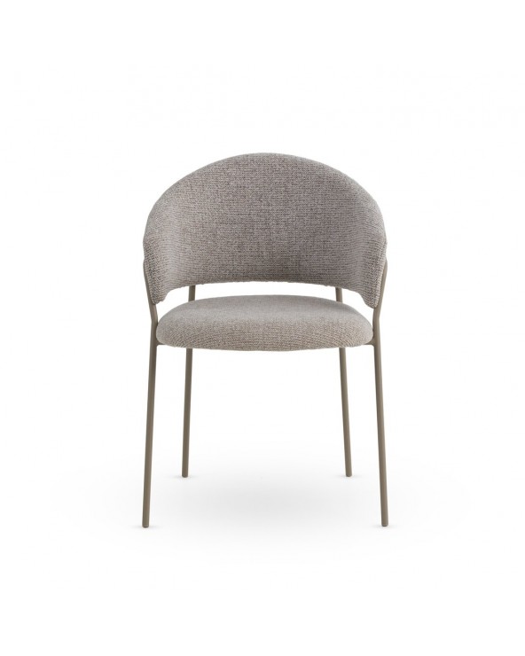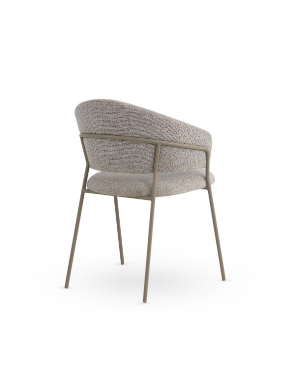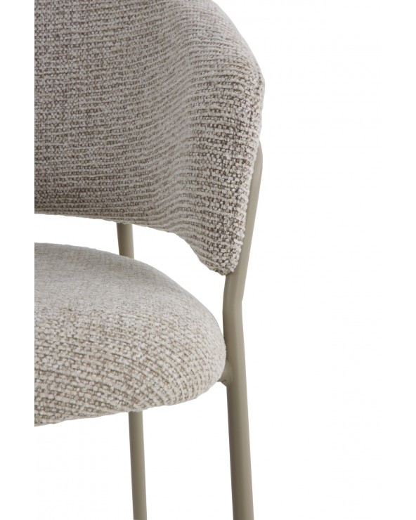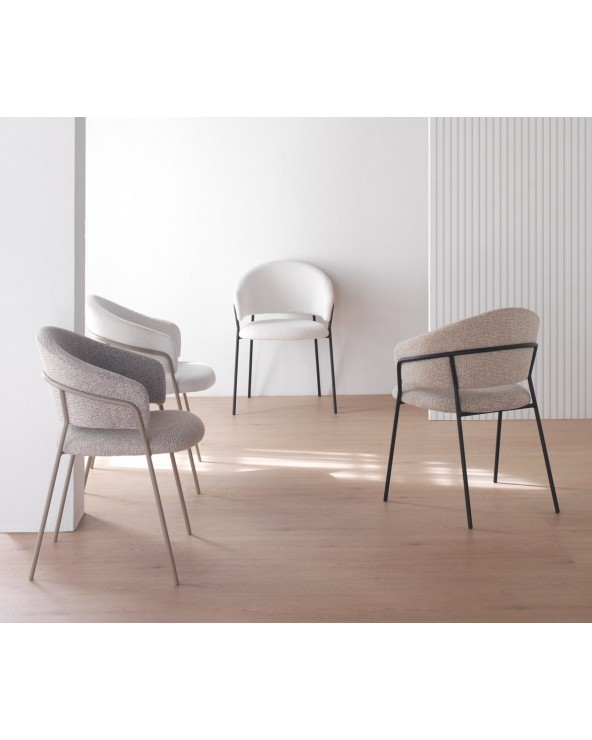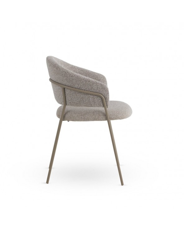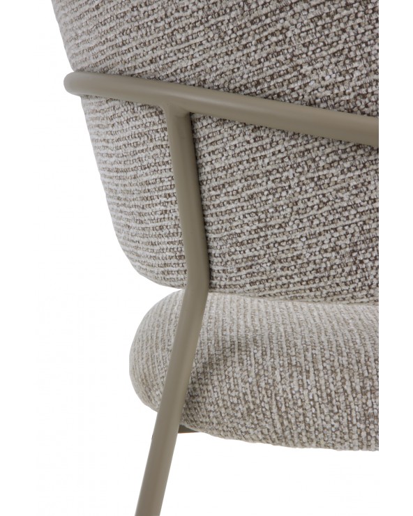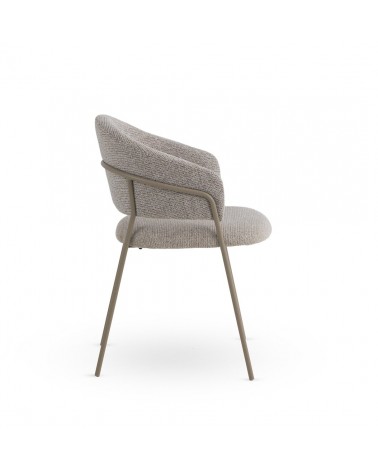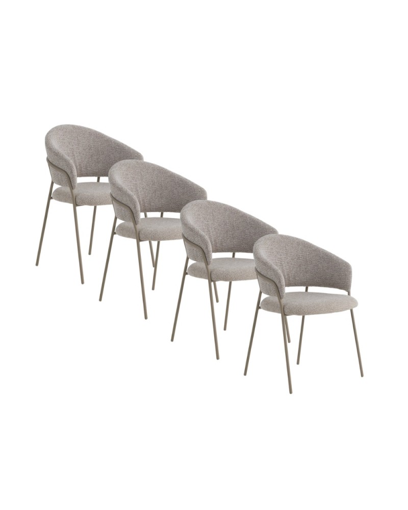 Pack de 4 sillones tapizados en chenilla color marrón suave, un tejido de tacto muy suave que aporta elegancia y confort, con estructura y patas de metal en color topo que garantizan estabilidad y durabilidad. Cada sillón cuenta con un asiento de 48 cm de altura, respaldo de 35 cm, apoyabrazos a 68 cm, y unas medidas de asiento de 45 cm de ancho por 47 cm de profundidad. El montaje es sencillo, únicamente requiere fijar las patas.