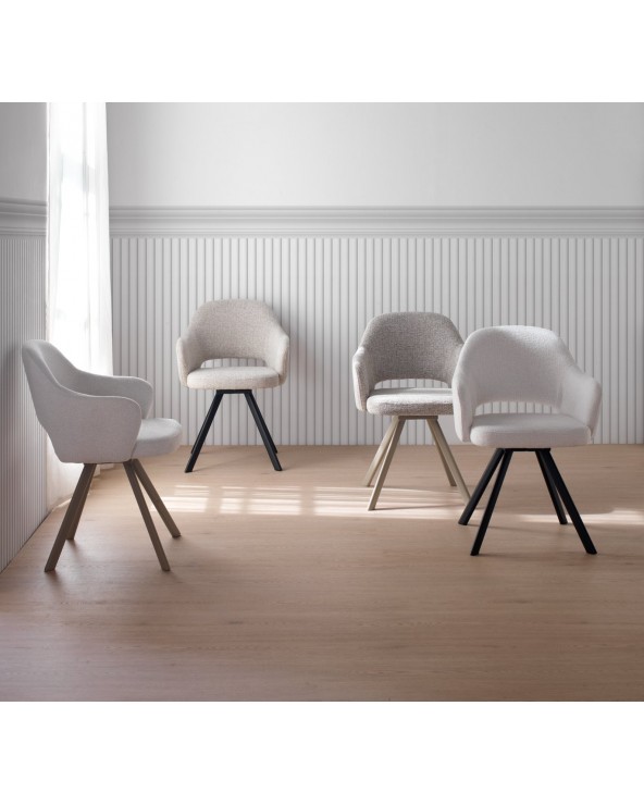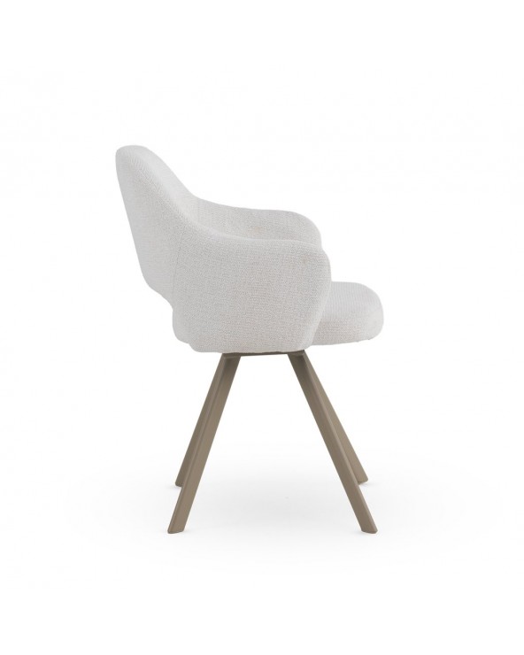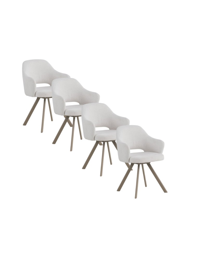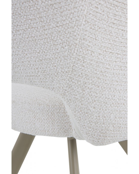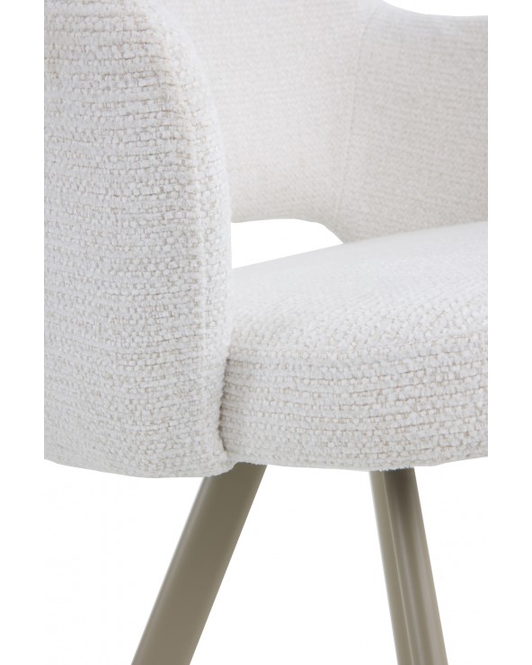 Pack de 4 sillones tapizados en chenilla color crema, un tejido de tacto muy suave que combina elegancia y confort, ideal para comedores o salas modernas. Su estructura y patas de metal en color topo aportan solidez, durabilidad y un estilo contemporáneo. Con una altura de asiento de 49 cm, apoyabrazos a 66 cm y respaldo de 37 cm, ofrecen una excelente ergonomía y comodidad. El asiento, de 46 cm de profundidad y 44 cm de ancho, garantiza una experiencia confortable. Además, requieren un montaje sencillo de las patas, lo que facilita su instalación.