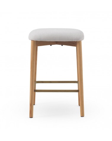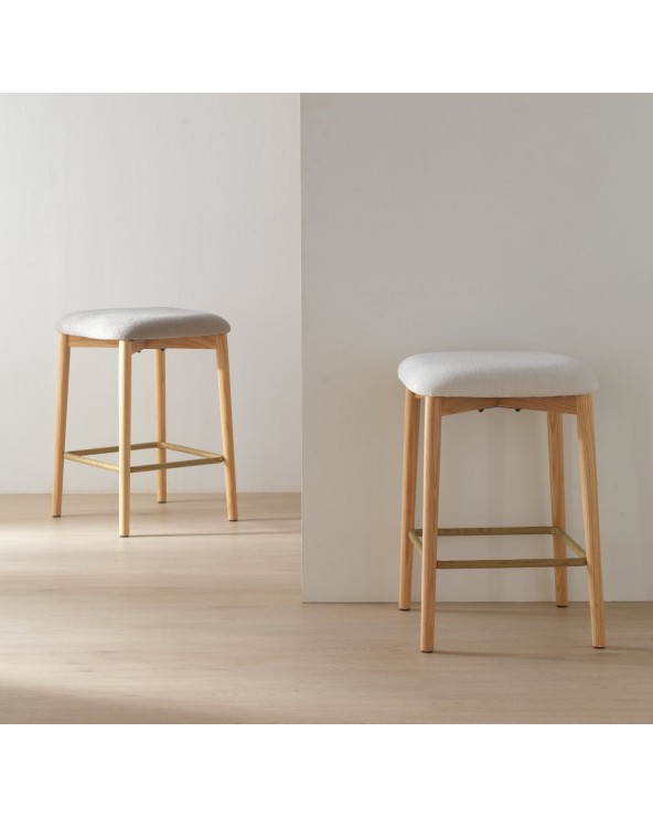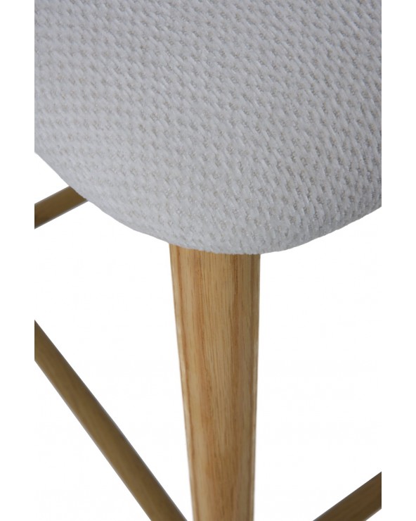 Pack de 2 taburetes fabricados en madera maciza de roble natural y tapizados en tejido de chenilla blanca suave, que destacan por su diseño elegante, confort y resistencia. Cada taburete cuenta con un reposapiés metálico a 20 cm del suelo, asiento de 65 cm de altura, 45 cm de ancho y profundidad, y un acolchado de 5 cm de grosor que garantiza una gran comodidad. Su estilo natural y versátil los hace perfectos para cocinas, barras o islas, y requieren un montaje sencillo de las patas.