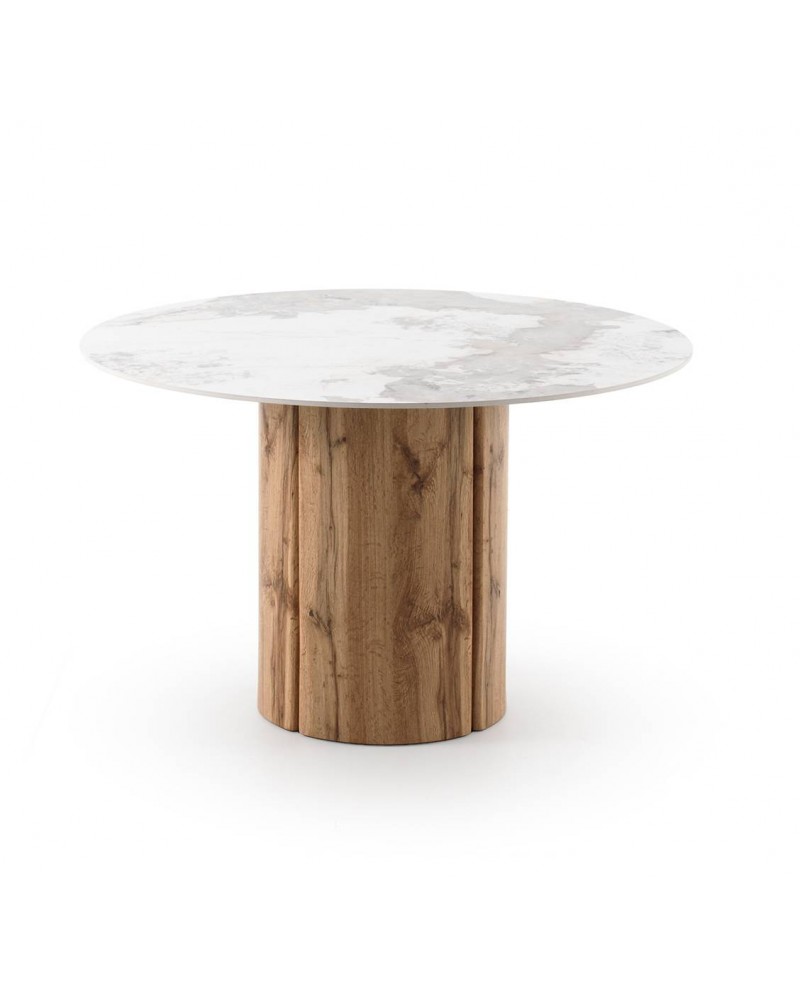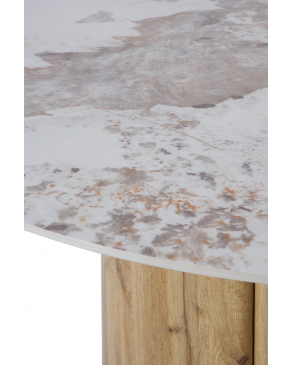 La table à manger ronde de 120 cm de diamètre est fabriquée en panneaux de particules de densité moyenne avec une finition en chêne, lui conférant un aspect élégant et moderne. Sa surface en céramique de 1 cm d'épaisseur avec une finition brillante imite le marbre, lui apportant résistance et sophistication. La base cylindrique, également en panneau de particules de densité moyenne plaqué chêne, a un diamètre de 50 cm, ce qui lui confère stabilité et harmonie. La structure nécessite un montage simple, ce qui facilite son installation et son utilisation dans des espaces contemporains qui recherchent fonctionnalité et style.