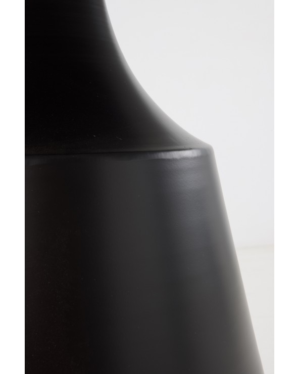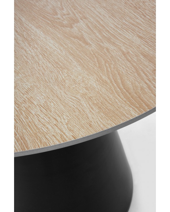 Table de salle à manger ronde d'un diamètre de 90 cm. La base de la table est en métal noir de forme conique, d'un diamètre de 40 cm, ce qui lui confère stabilité et design moderne. Le plateau de la table est en céramique avec une finition mate et a une épaisseur de 1 cm, imitant l'aspect du bois de frêne. Dans l'ensemble, la combinaison des matériaux et des couleurs offre une pièce élégante et fonctionnelle pour la salle à manger.
