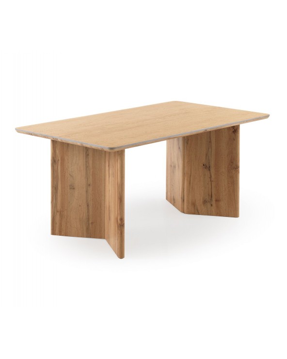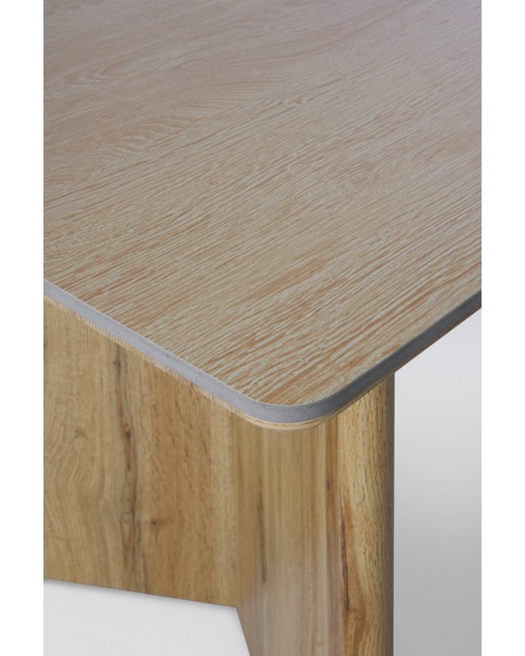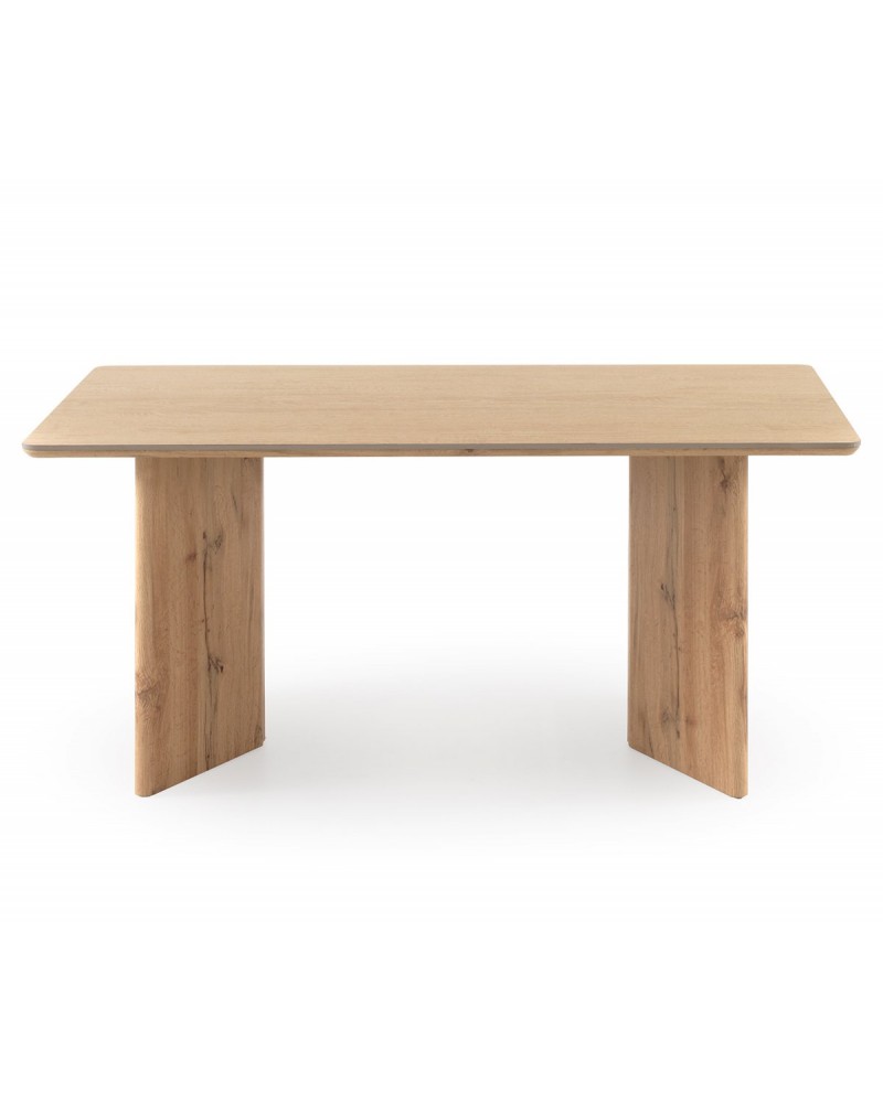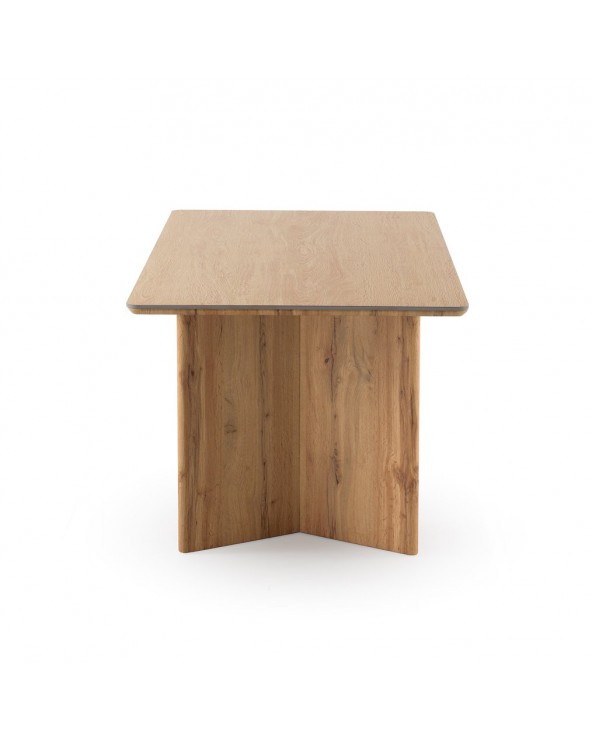 La table de salle à manger rectangulaire de 200 x 100 cm est conçue en chêne robuste et dispose d'un plateau en céramique de 1 cm d'épaisseur, posé sur un panneau en bois de 2 cm, avec une finition mate qui lui confère un aspect élégant et résistant. Les bords de la table sont légèrement arrondis, ce qui adoucit sa forme. Elle est soutenue par deux pieds en chêne, avec une distance interne de 110 cm et une distance totale entre eux de 150 cm, offrant stabilité et espace suffisant pour le confort. Son montage est simple, ce qui facilite son installation et son utilisation dans n'importe quelle salle à manger.