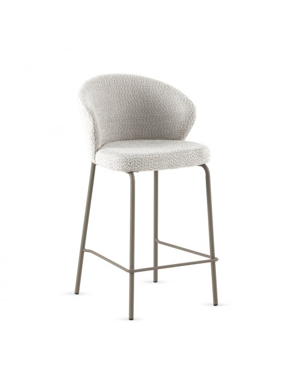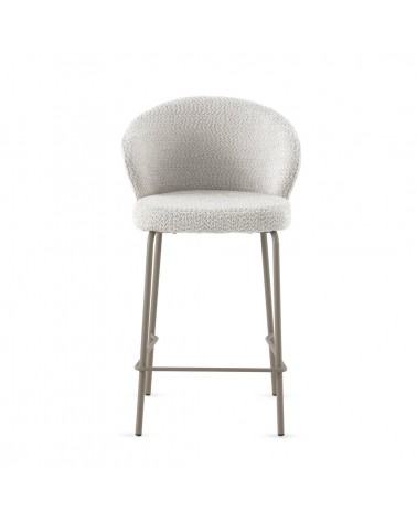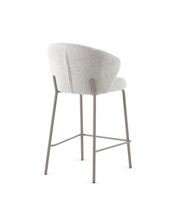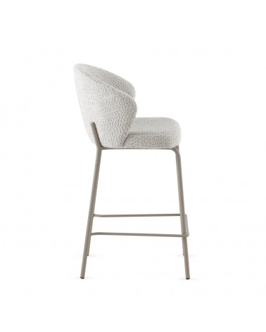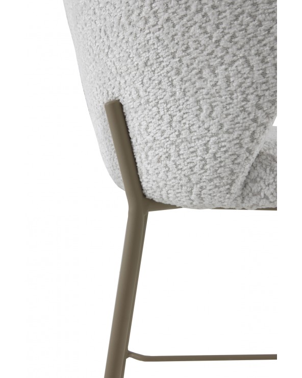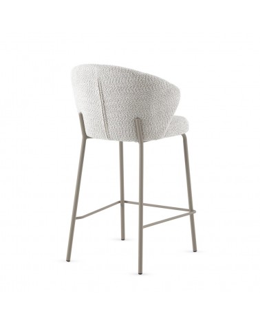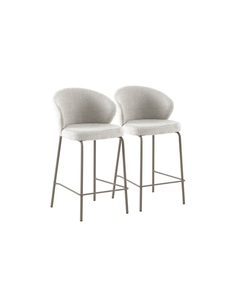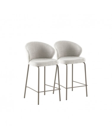Lot de 2 tabourets rembourrés en chenille blanche 100 % polyester au toucher doux, avec structure et pieds tubulaires métalliques de couleur taupe et hauteur d'assise de 65 cm ; ils ont un dossier de 28 cm et un repose-pieds de 20 cm, offrant un ensemble moderne et élégant. Ils nécessitent un montage simple et sont parfaits pour compléter les intérieurs contemporains avec une touche lumineuse grâce à leur revêtement doux et leurs pieds métallisés.