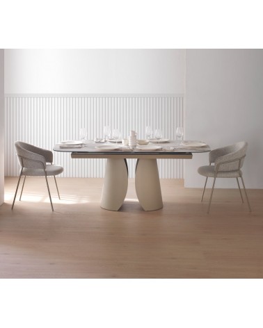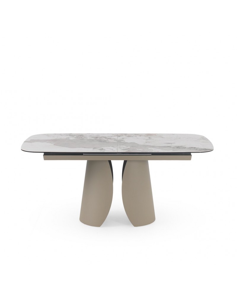 Table de salle à manger extensible de forme rectangulaire avec coins arrondis, dimensions 180/240 x 95 cm, avec rallonge permettant d'augmenter la longueur de 180 à 240 cm et ouverture/fermeture automatiques en tirant/poussant aux deux extrémités. Plateau en céramique type granit Patagonia de couleur blanche, finition mate et épaisseur de 1 cm. Pieds et structure métalliques de couleur taupe, conçus pour supporter le poids du plateau et assurer la stabilité. Capacité pour 8 à 10 convives, idéal pour les réunions ; nécessite un montage, car il s'agit d'un article lourd.