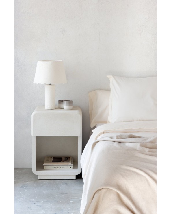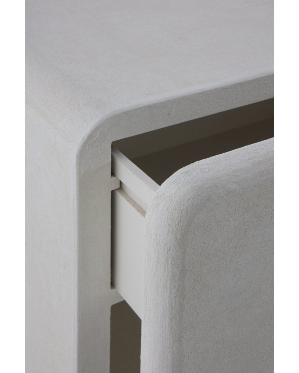 Cette table de chevet à un tiroir, fabriquée en polyrésine et recouverte de microciment blanc, présente un design rectangulaire aux bords arrondis qui lui confère un style moderne et serein. Elle dispose d'un tiroir supérieur de 38 × 28 × 16 cm avec des glissières en bois qui garantissent un glissement en douceur, ainsi que d'un espace inférieur de 45 × 34 × 38 cm idéal pour un rangement supplémentaire. Sa structure solide et monolithique ne nécessite aucun assemblage, ce qui permet de la placer et de l'utiliser immédiatement dans n'importe quelle chambre à coucher.