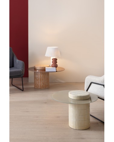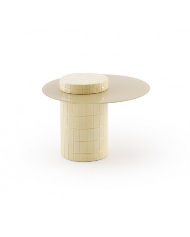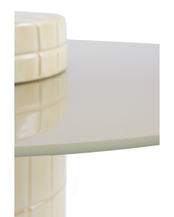 Définie par son caractère contemporain, cette table d'appoint se distingue par sa base cylindrique décentrée unique et son plateau en verre couleur vanille au fini brillant. Avec un diamètre de 60 cm, une hauteur de 38 cm et un poids net de 12,70 kg, c'est une pièce qui équilibre parfaitement originalité et robustesse, idéale pour apporter dynamisme et élégance à tout espace moderne.