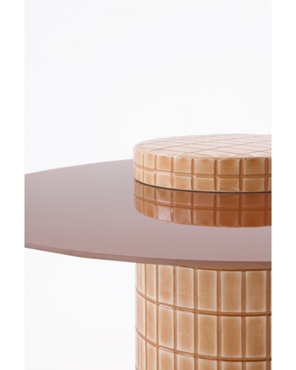 Cette table d'appoint sophistiquée au style contemporain se caractérise par sa base cylindrique décentrée unique et son élégant plateau en verre couleur terracotta au fini brillant. Avec un diamètre de 80 cm, une hauteur de 44 cm et un poids net de 20,30 kg, c'est une pièce qui allie présence et robustesse, idéale pour apporter du caractère et de la chaleur à tout intérieur moderne.