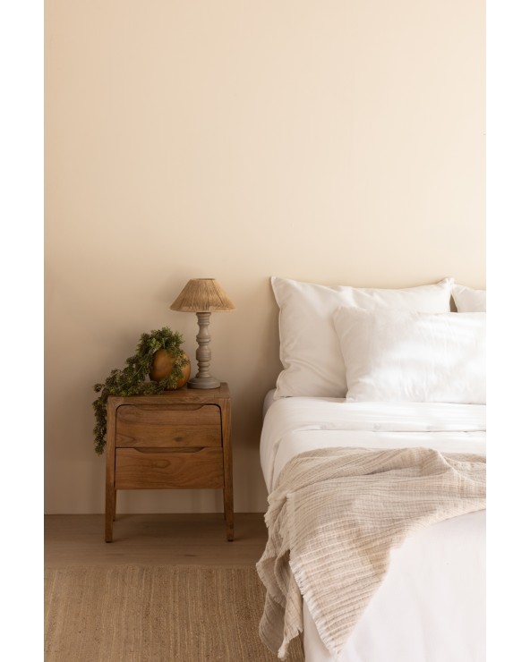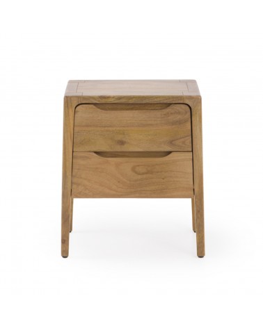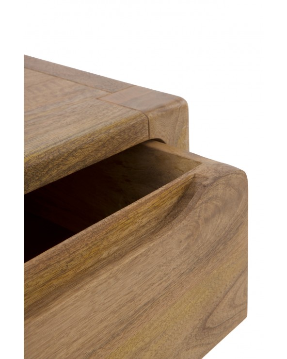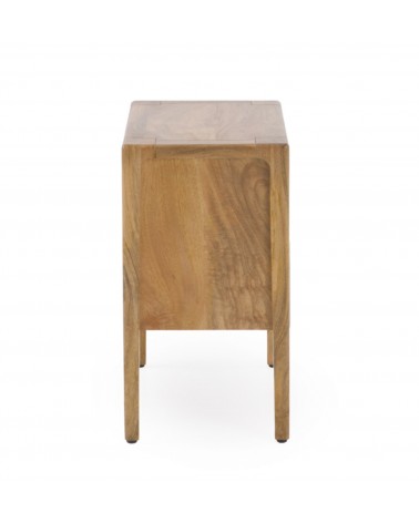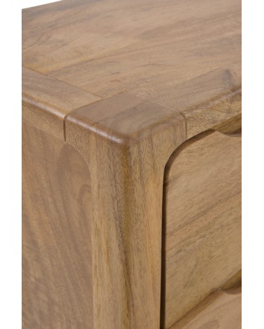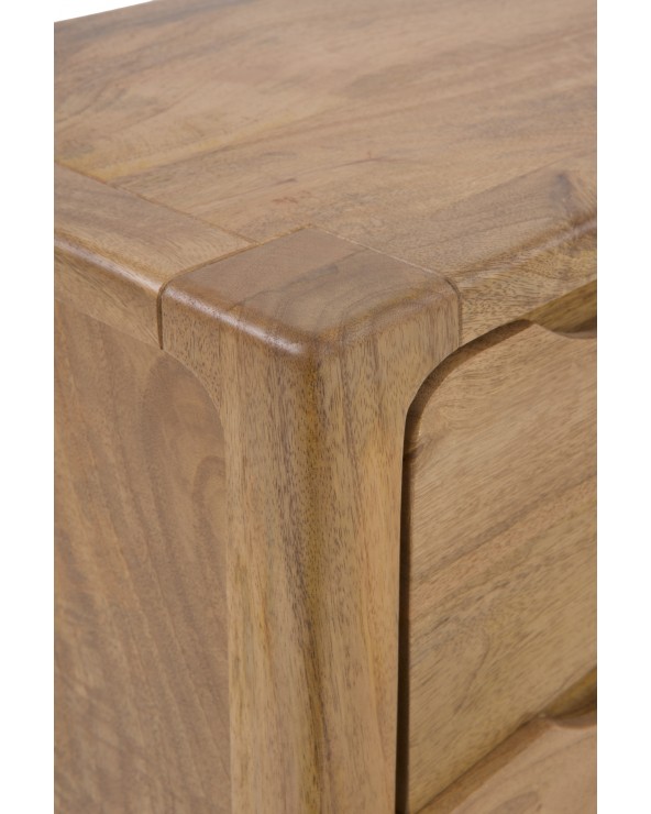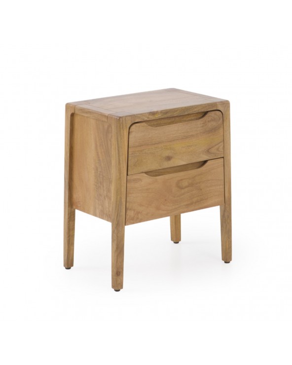 Sublimez l'esthétique de votre chambre avec cette table de chevet en manguier massif, un design qui mise sur la douceur de ses coins arrondis pour créer une pièce visuellement légère et harmonieuse. Sa structure de forme rectangulaire intègre deux tiroirs avec des glissières en bois et un système d'ouverture par prise de main qui souligne la continuité du veinage naturel. Élevée sur des pieds stylisés de 20 cm et avec une capacité intérieure des tiroirs de 32x23x12 cm, cette table de chevet est livrée entièrement montée, garantissant une solution de rangement robuste, artisanale et d'une grande valeur décorative.