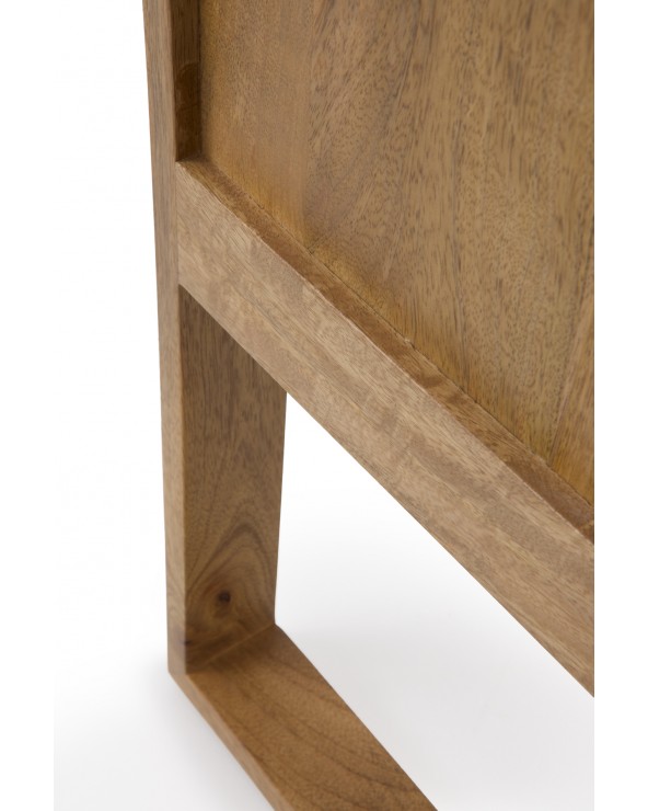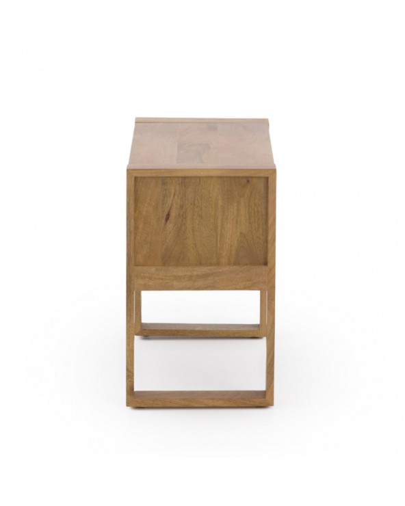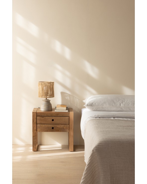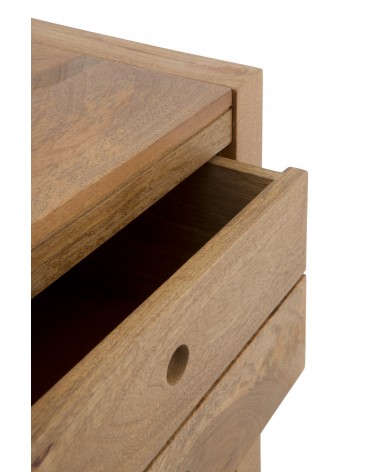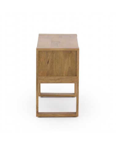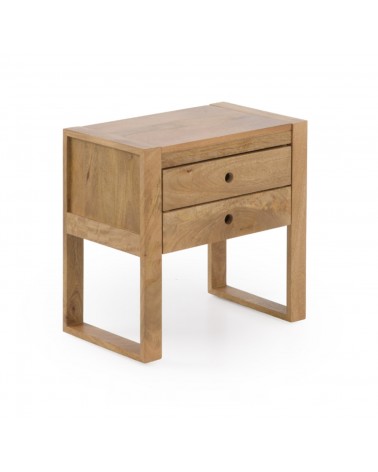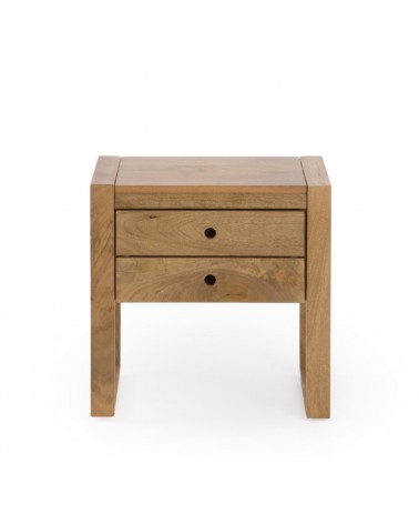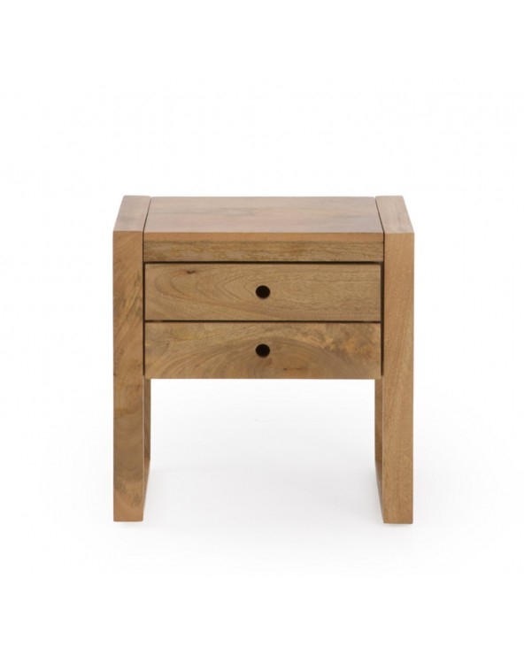 Cette table de chevet sophistiquée a été fabriquée de manière artisanale en manguier massif, un matériau prisé pour sa robustesse et la beauté de son veinage naturel. Son design rectangulaire d'inspiration contemporaine se caractérise par des angles arrondis qui apportent une esthétique organique et sécurisée pour la maison. La pièce offre une solution de rangement polyvalente, combinant un tiroir au coulissement fluide avec une niche ouverte généreuse de 33x23x16 cm. Élevée sur une base métallique avec des pieds en forme de U de 25 cm, cette table garantit une grande stabilité tout en facilitant le nettoyage du sol. Le meuble est livré entièrement assemblé pour une utilisation immédiate.