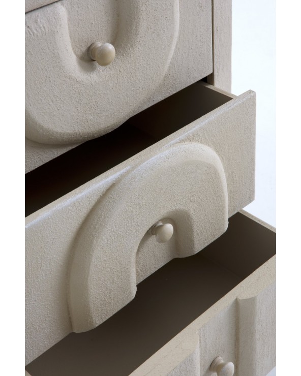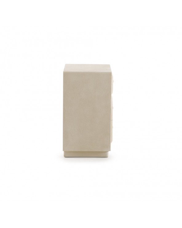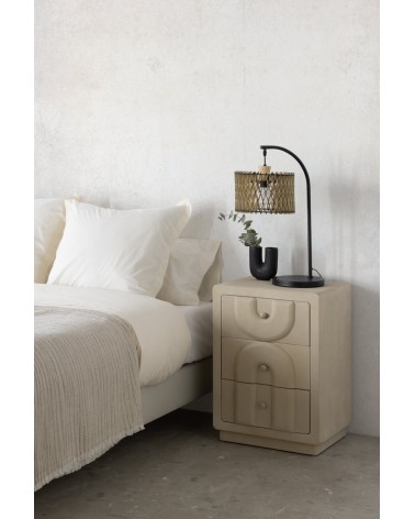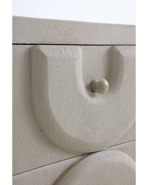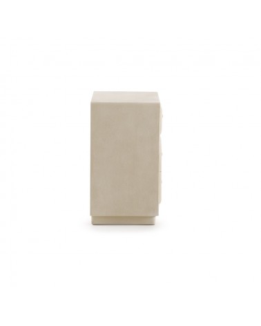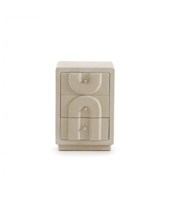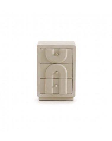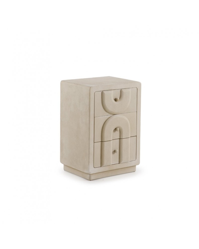 Esta mesa de cabeceira com três gavetas, fabricada em poliresina e revestida com microcimento na cor areia, apresenta uma forma retangular com cantos arredondados que conferem um estilo moderno e suave. As suas gavetas, com medidas interiores de 37,5 × 28 × 13 cm, oferecem um espaço prático de arrumação e têm puxadores e guias de madeira que acrescentam um toque acolhedor e natural. O seu design monolítico não requer montagem, permitindo desfrutar imediatamente em qualquer quarto.