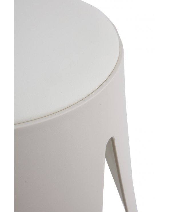 Pacote de 4 bancos baixos em polipropileno na cor crua, com assento redondo de 30 cm de diâmetro e almofada fixa revestida em imitação de pele de toque suave, que proporciona conforto e um acabamento elegante. Fabricados com uma estrutura em polipropileno de alta resistência, oferecem durabilidade e estabilidade. O seu design prático e funcional é entregue completamente montado, pronto a usar.