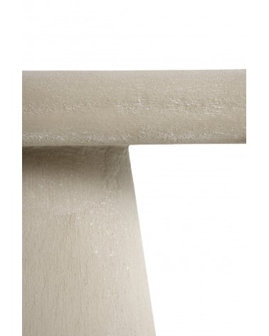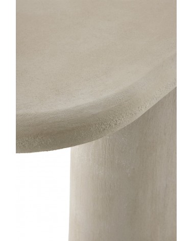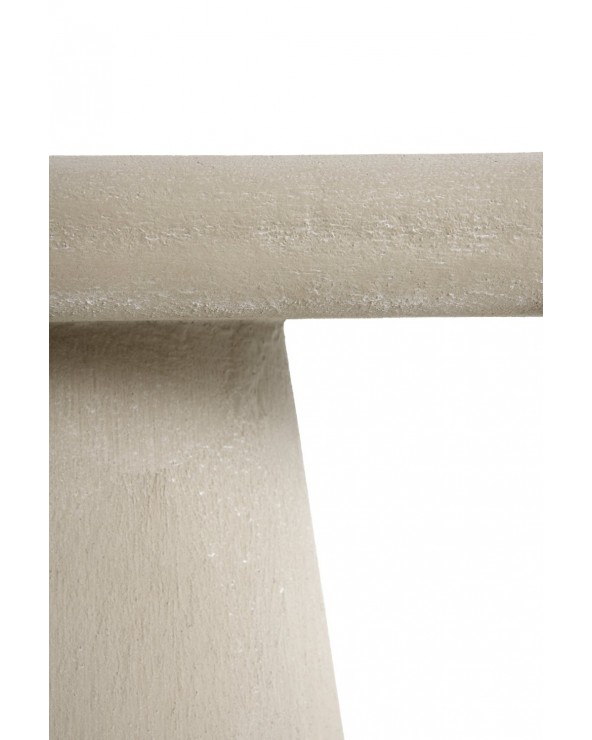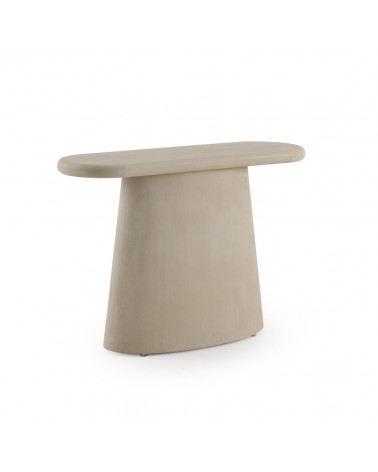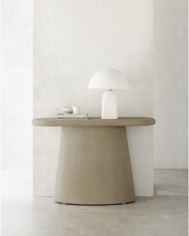 Esta consola oval apresenta um design contemporâneo com formas suaves e arredondadas e um acabamento em cimento cor de areia que confere um estilo natural e minimalista. A sua estrutura em poliresina é revestida com microcimento em tom areia, enquanto o tampo superior, com 5,5 cm de espessura, oferece solidez e presença visual. Graças à sua construção monobloco, não requer montagem, permitindo desfrutar imediatamente em qualquer espaço.