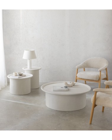 A mesa de centro redonda com 60 cm de diâmetro em cor cimento branco combina um design elegante e moderno com praticidade. A sua estrutura em poliresina, revestida com microcimento branco, garante resistência, durabilidade e um acabamento sofisticado de fácil manutenção. O tampo tem uma espessura de 3 cm, proporcionando leveza visual sem comprometer a estabilidade. Além disso, a mesa não requer montagem, permitindo uma utilização imediata e confortável desde o primeiro momento.